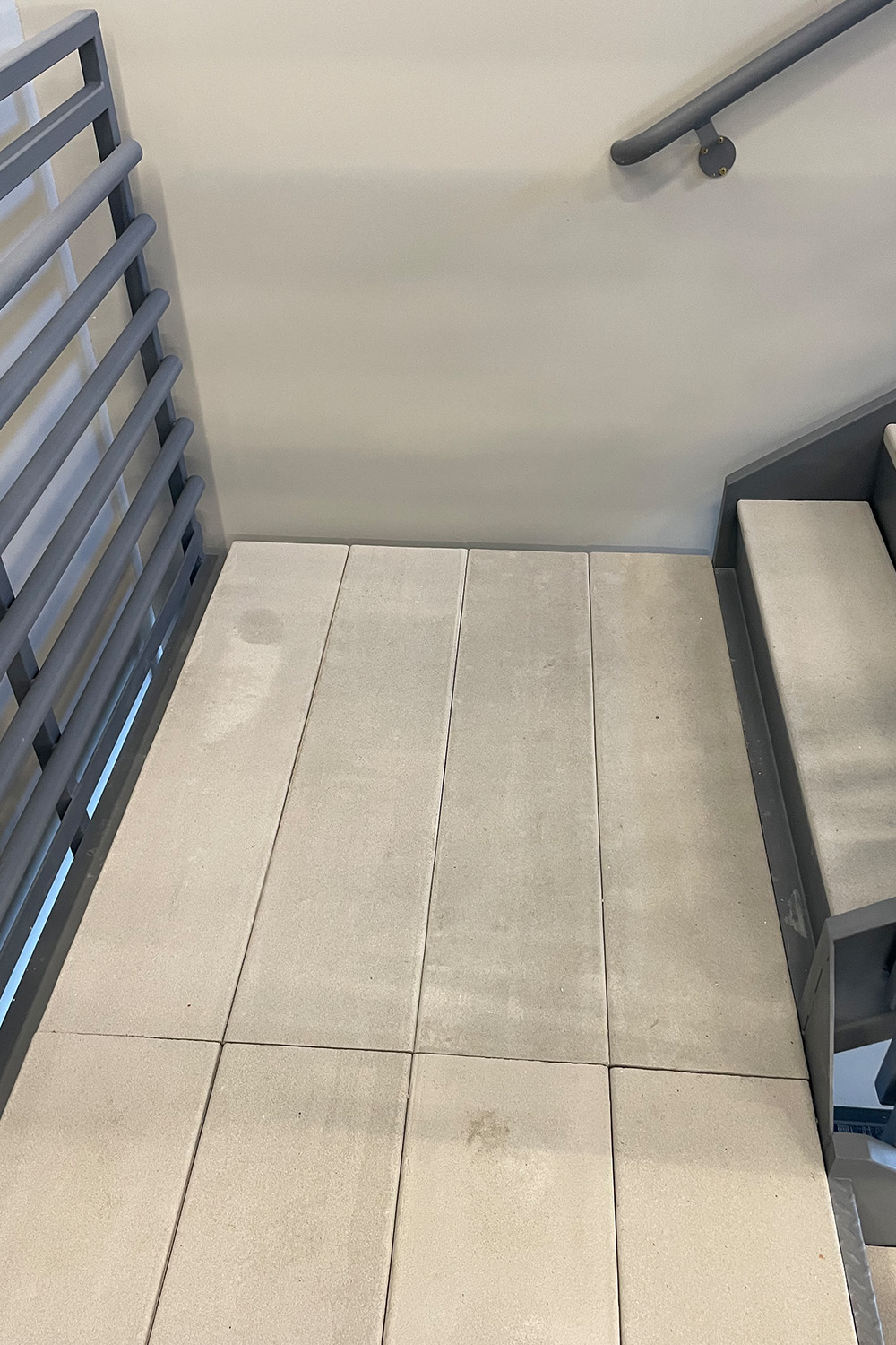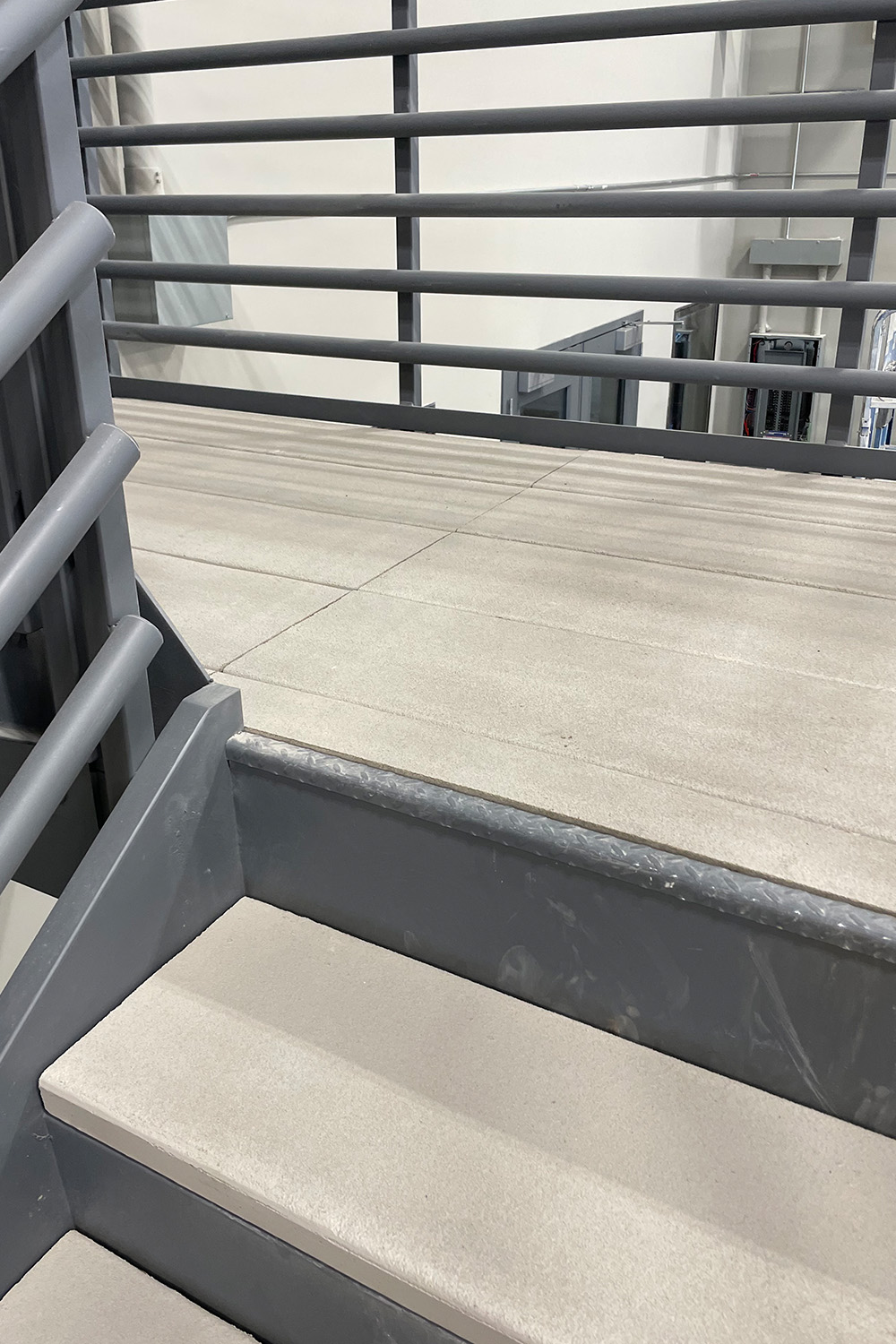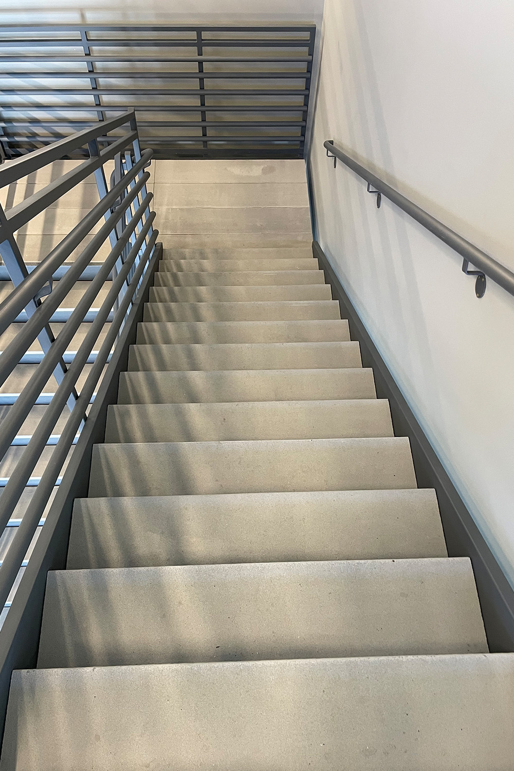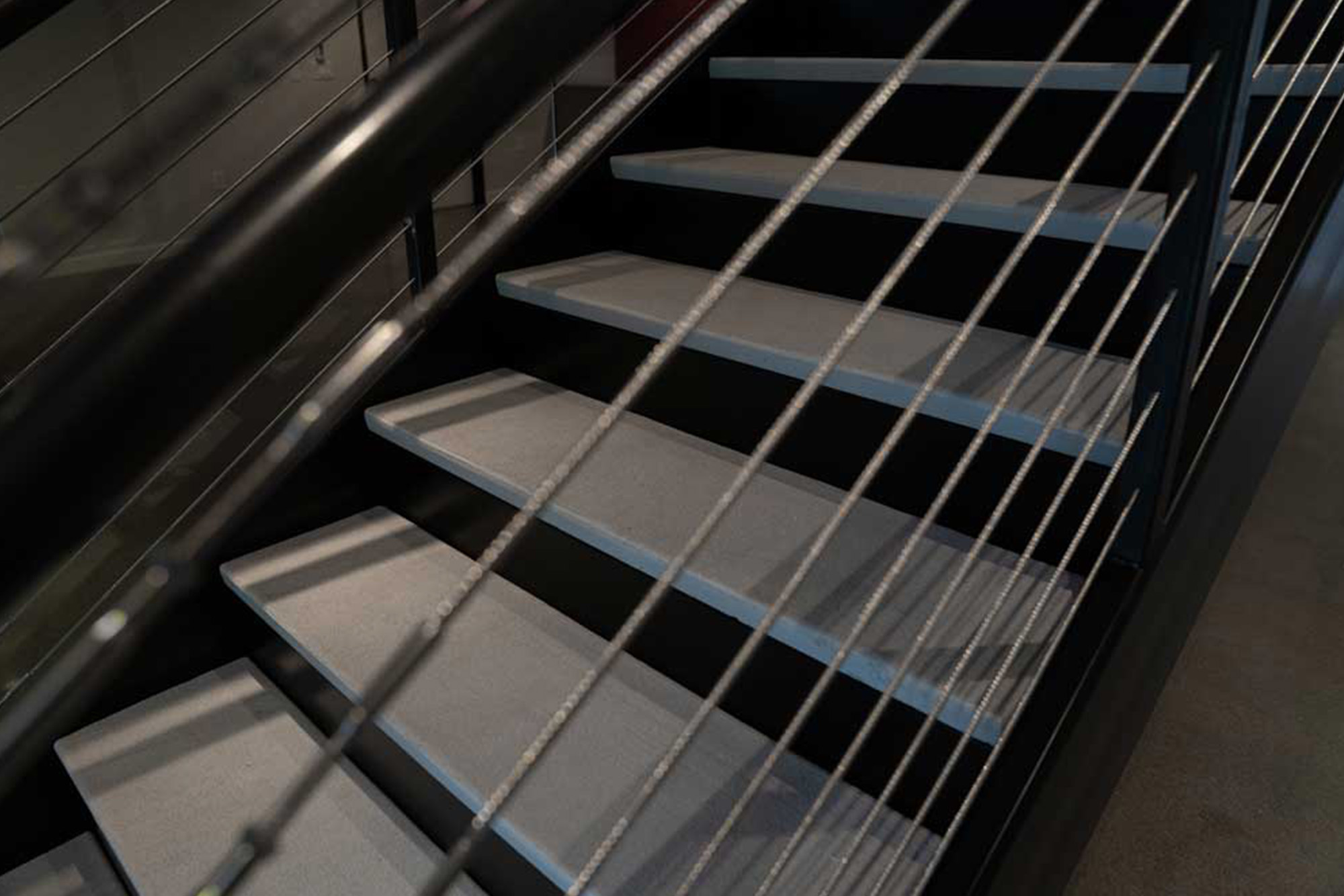 Our precast stair steps are built with a patented core, coated with 8k+ psi concrete. A single 48″ wide tread weighs only 34 pounds. 70% reduction in concrete, VOC emissions, and weight when compared to traditional precast stair treads.