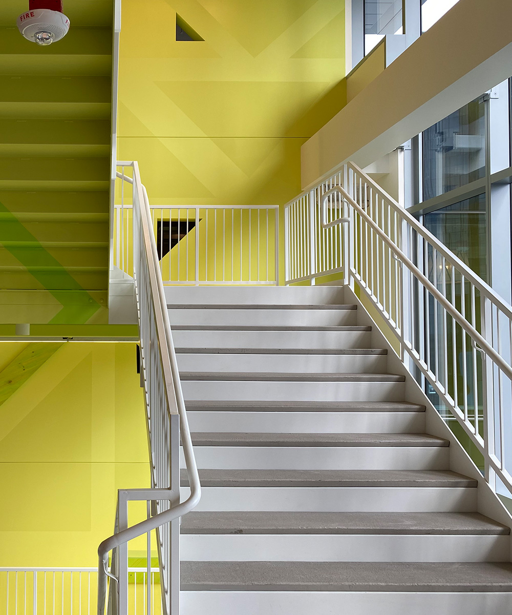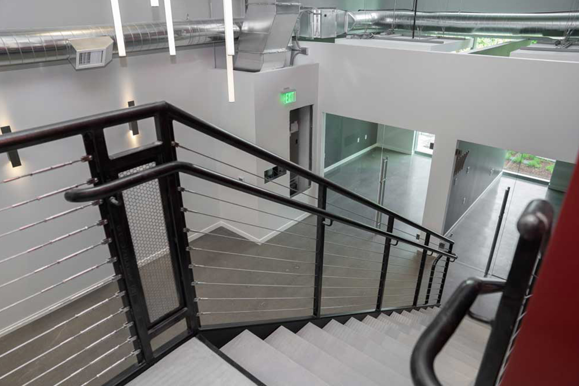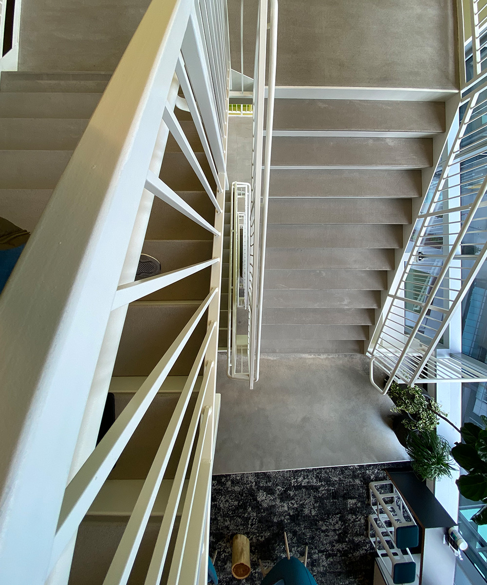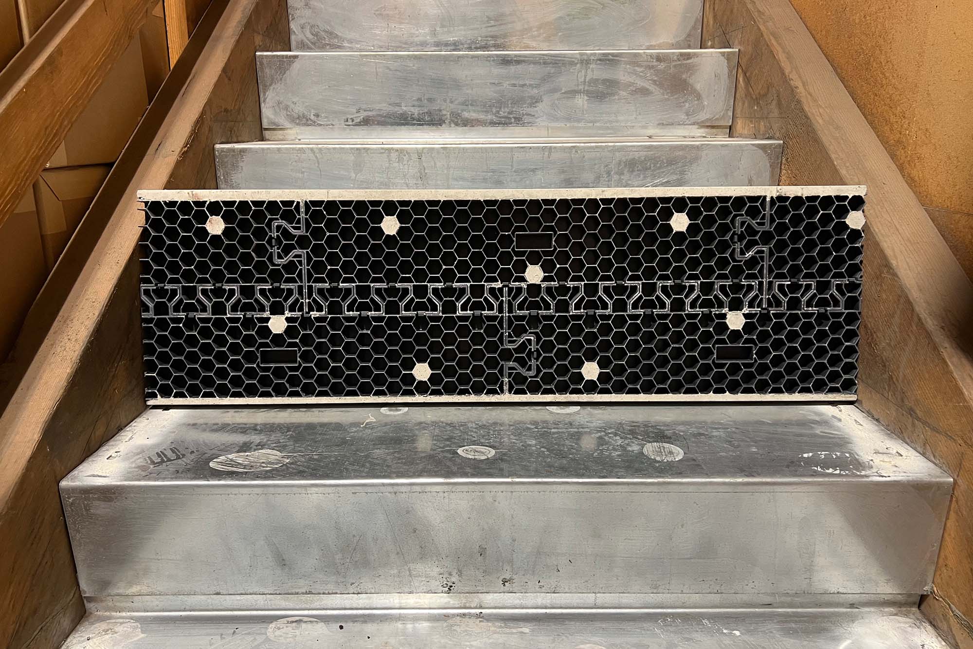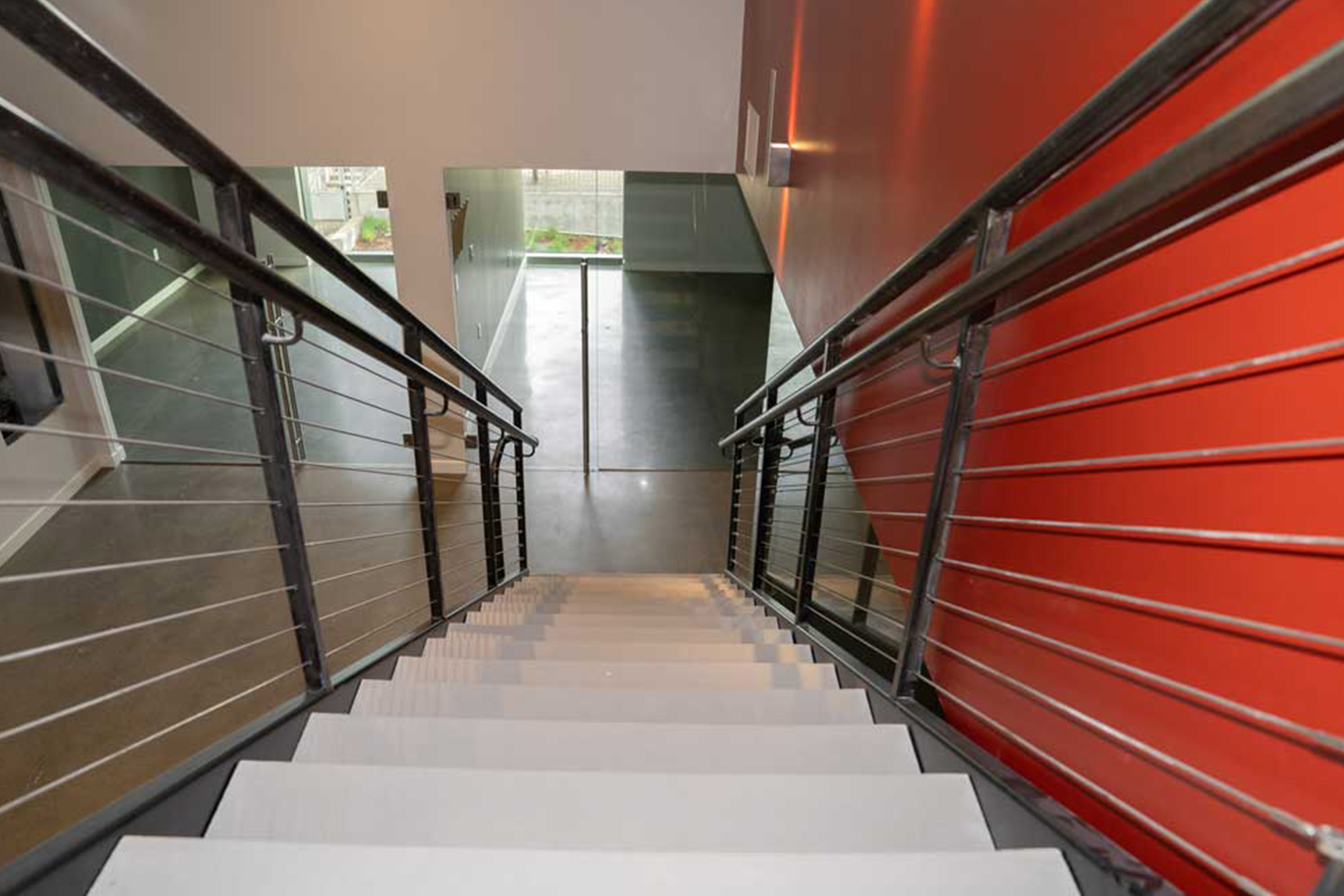 Our precast stair steps are built with a patented core, coated with 8k+ psi concrete. A single 48″ wide tread weighs only 34 pounds. 70% reduction in concrete, VOC emissions, and weight when compared to traditional precast stair treads.