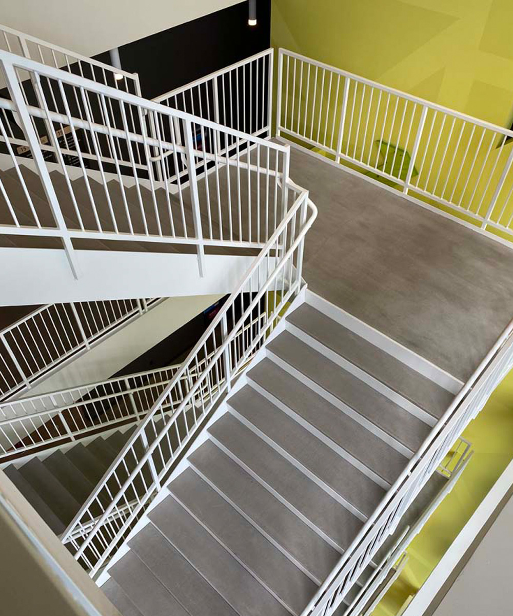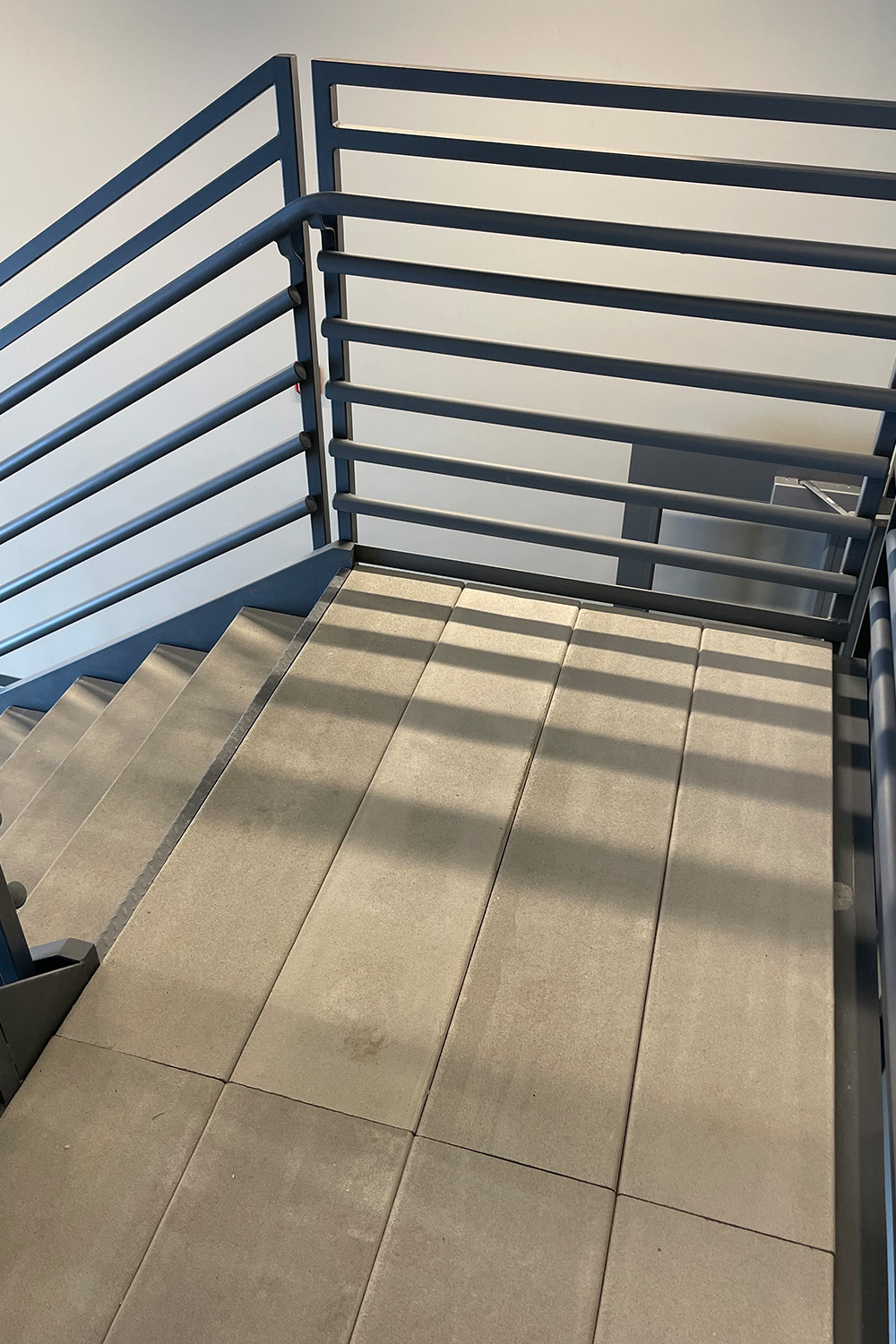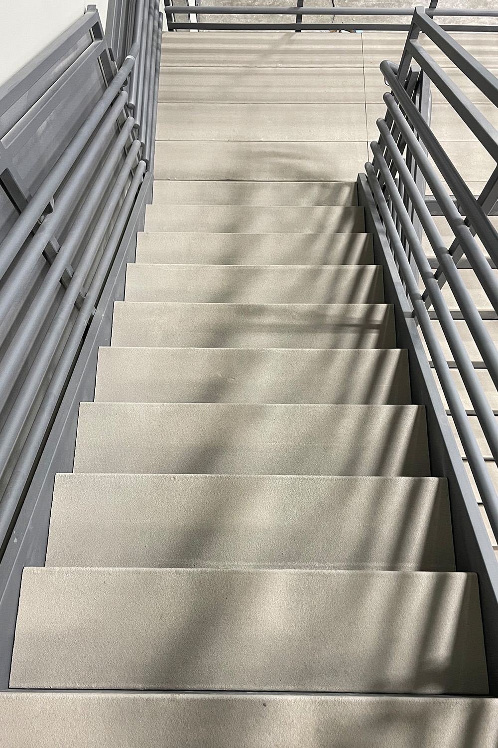 Designed to be set on top of flat metal stair pans. After the final painting of the stair, these treads are installed just before occupancy for a clean finish. Clients achieve an instant concrete stair without the traditional associated costs.