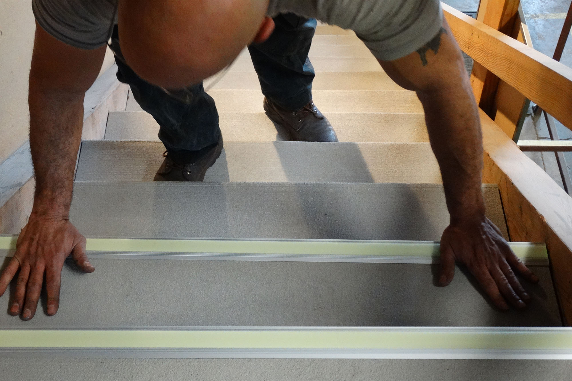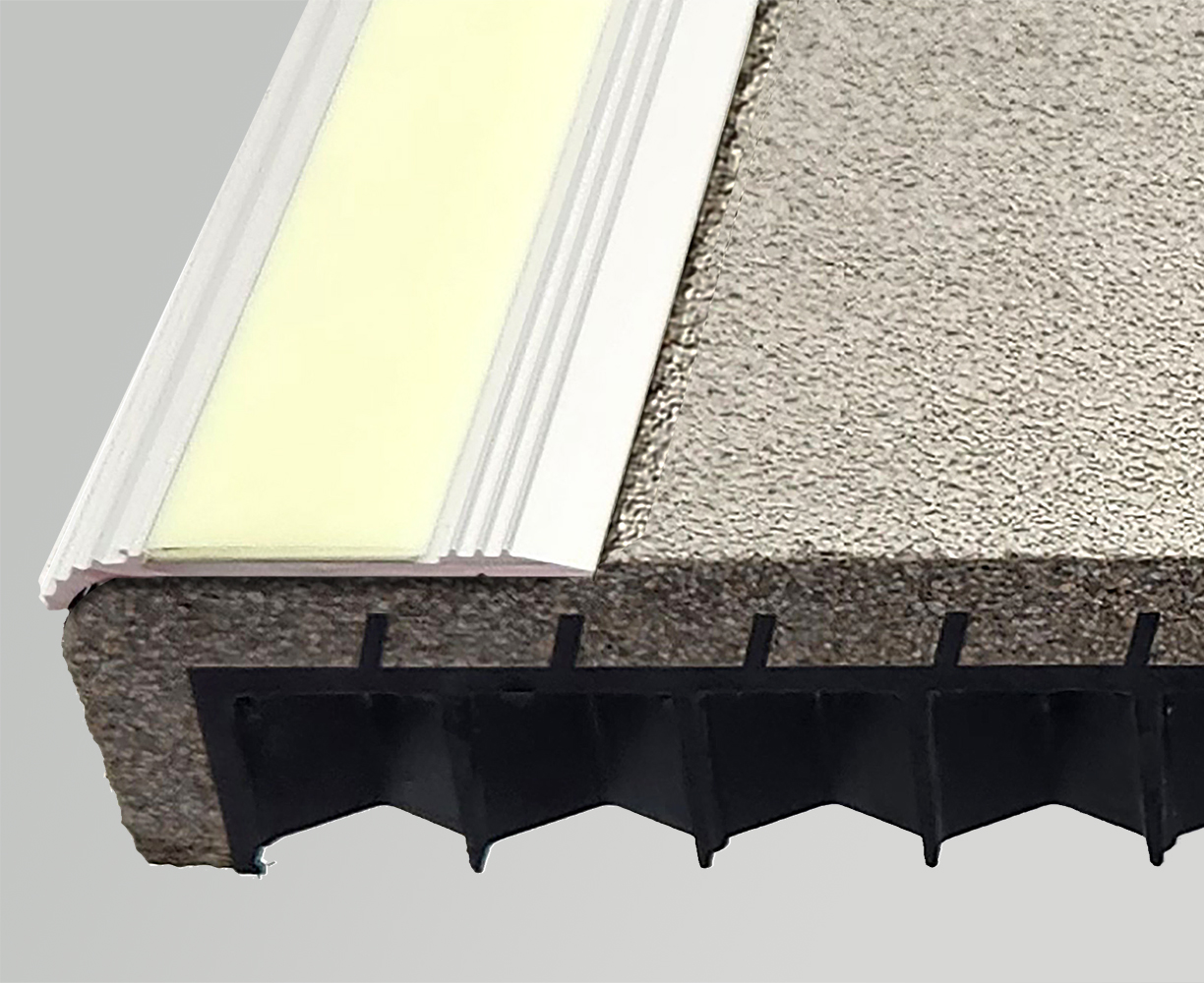 Enhance the slip-resistance and visibility of the stair treads. Abrasive, ribbed, contrasting stripe, grip strip or photoluminescent strip options available. Applied to the leading edge of the stair tread with using embedded method, marine grade adhesive, and/or mechanical fasteners.