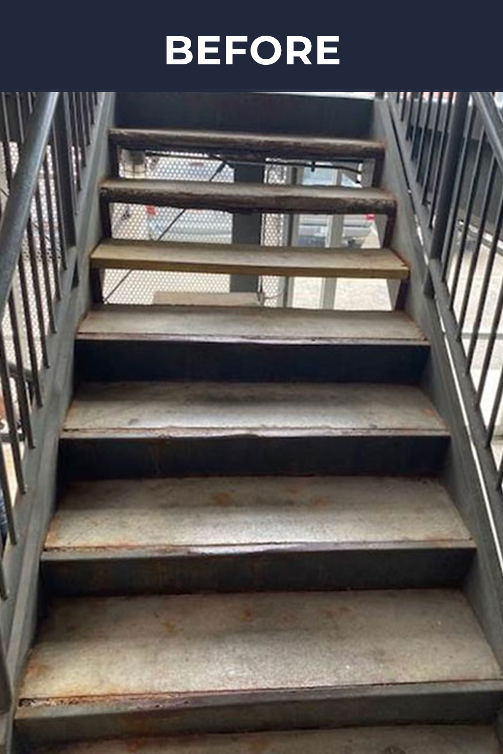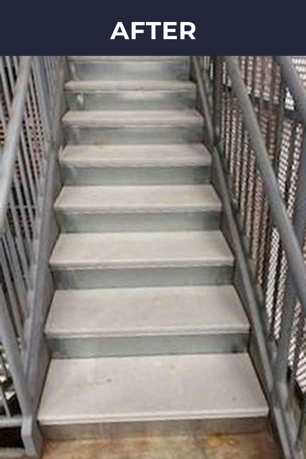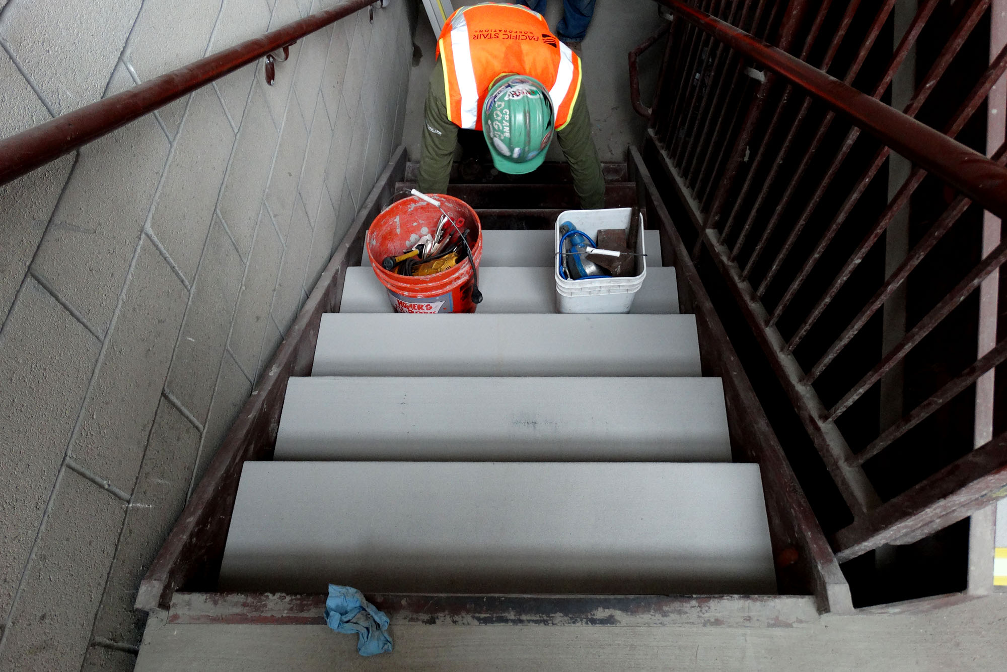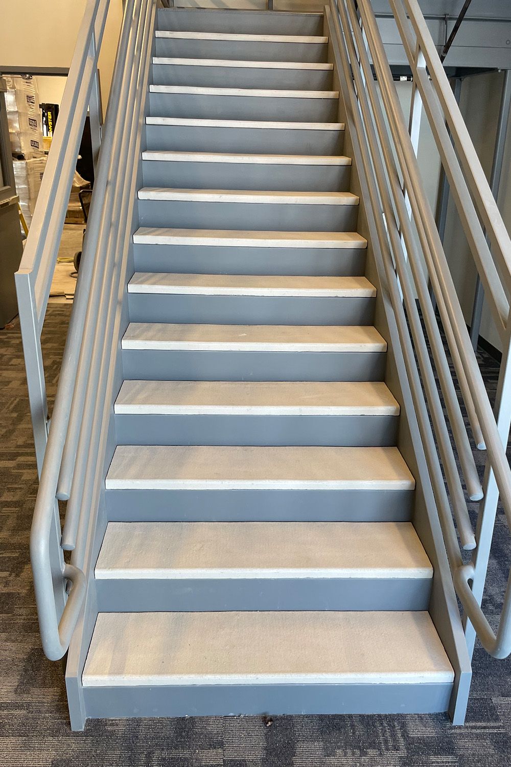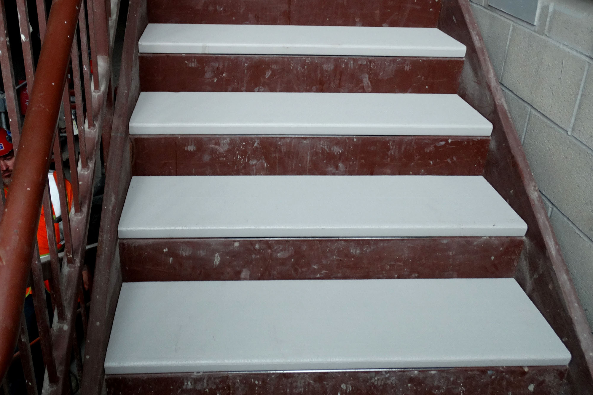 Rhino Tred eliminates all cost associated with pan filled stair treads. During construction the metal stair flat pans offer a non-trip walking surface for accessing floor levels. Just before occupancy of the building the metal stairs are cleaned, often finish painted, and Rhino Tred is quickly installed for an instant concrete finish.