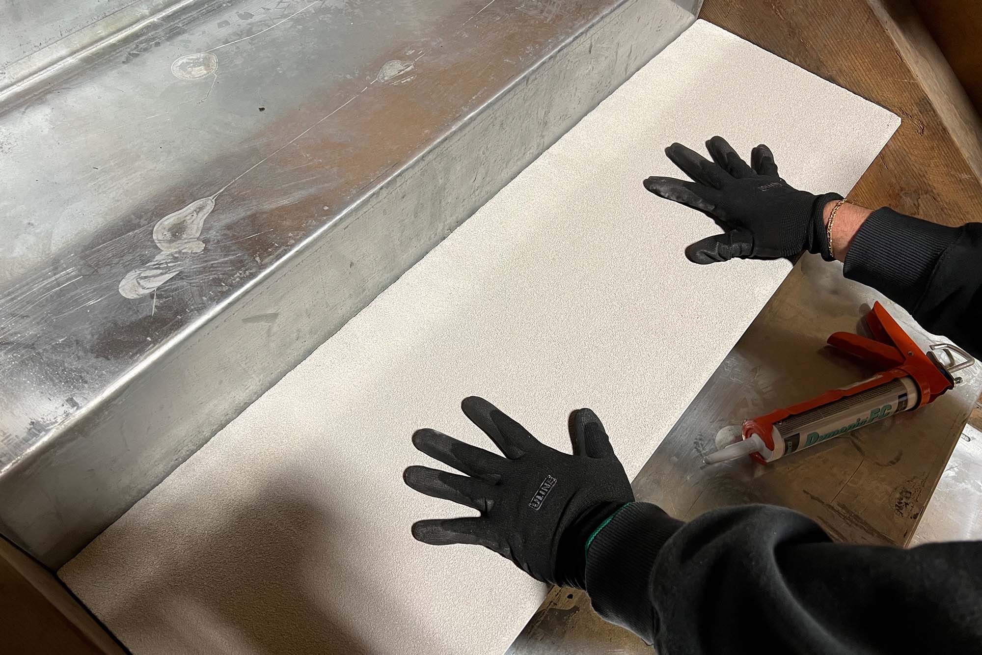 The most affordable and popular solution. The low profile aluminum nosing attaches to the top face. Shop applied or on site by others using recommended marine grade adhesive for a permanent application.