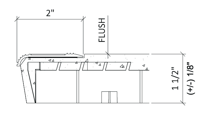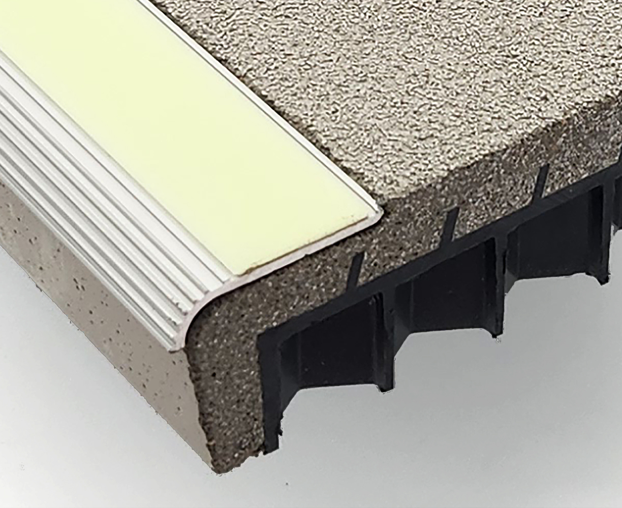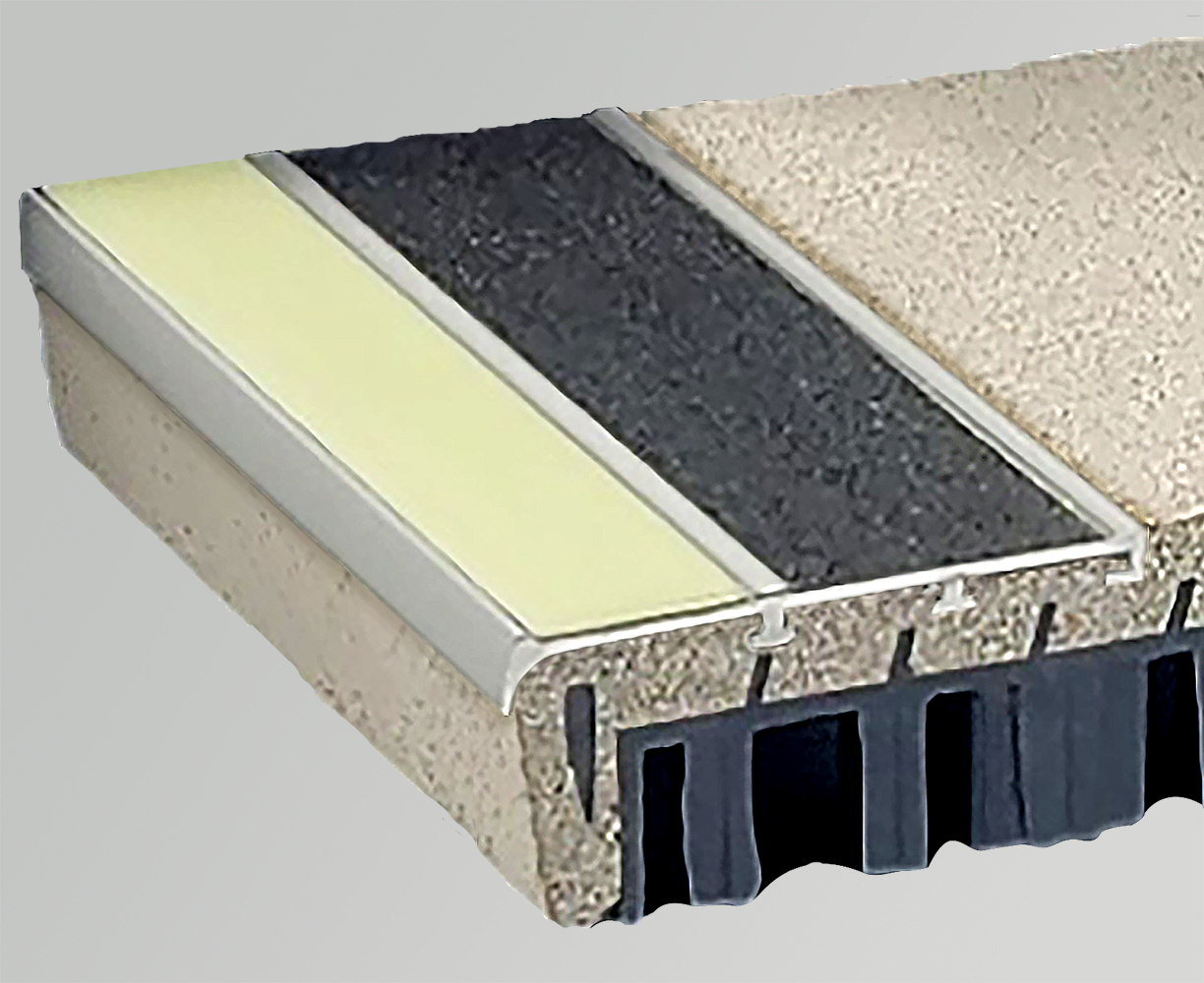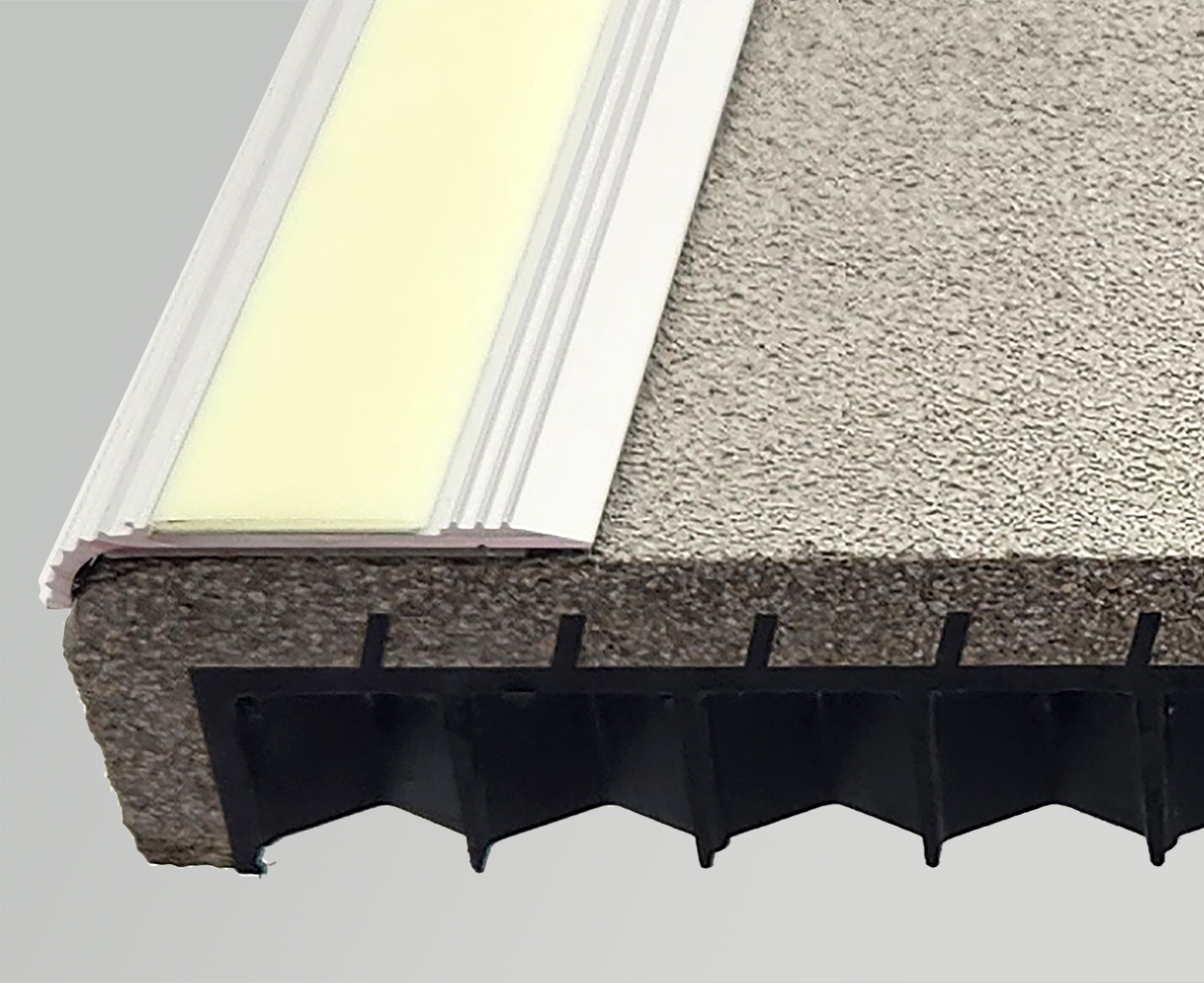 Additional costs and lead time apply. This nosing option is embedded into the wet concrete pour during manufacturing for a flush transition.