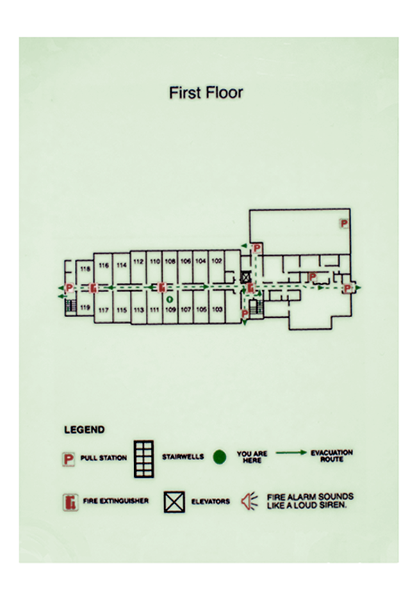 EVACFLTR | Photoluminescent custom made evacuation map sign. Displays path from current position to exit discharge location.