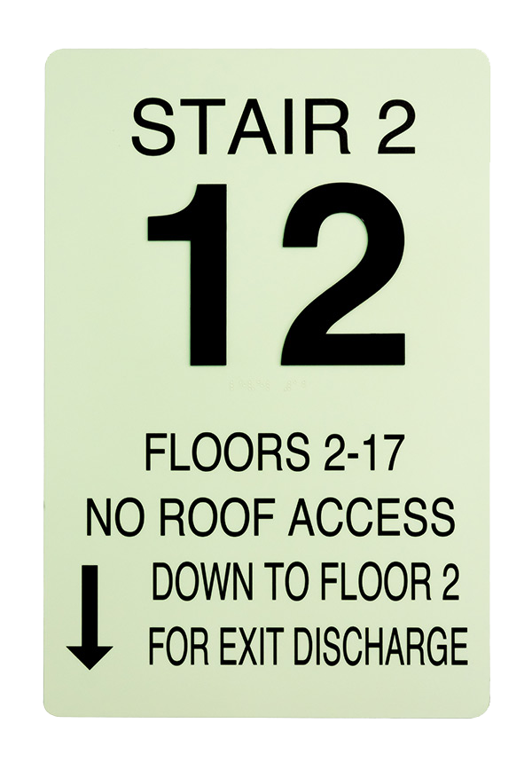 Stairwell photoluminescent egress path marking signs for commercial, industrial, or residential buildings. Creates photoluminescent / luminous wayfinding with high visibility contrast and illuminated during no-light, low-light conditions, or during emergencies. Directs occupants to the final exit. The complete code required exit signs that require no electricity wiring or battery backup. IBC, IFC, NFPA, ASTM, UL compliant.