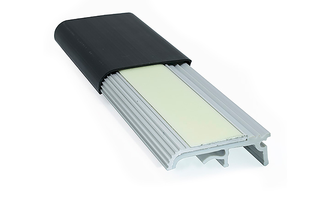 STNS | Low profile, 1.5” wide extruded aluminum nosing with peel and stick backing with protective construction cover for shop apply to metal stair systems during fabrication.