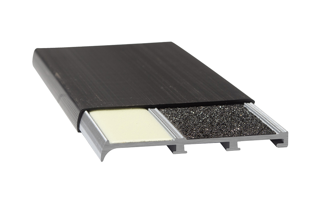 STNRS | Low profile, 2” wide extruded aluminum nosing with peel and stick adhesive and protective construction cover included. Installed on metal stair treads during fabrication.