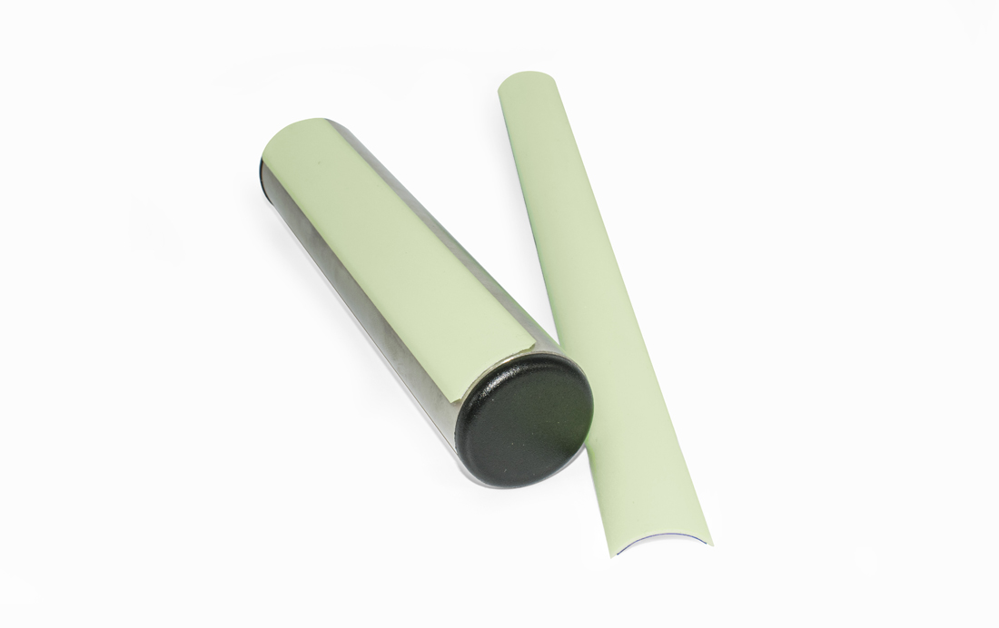 STNH | Commercial grade, high use, interior applications. Pre-curved to grab round handrail only. Low profile, 1” wide curved extruded polymer resin photoluminescent stripe with peel and stick foam adhesive.