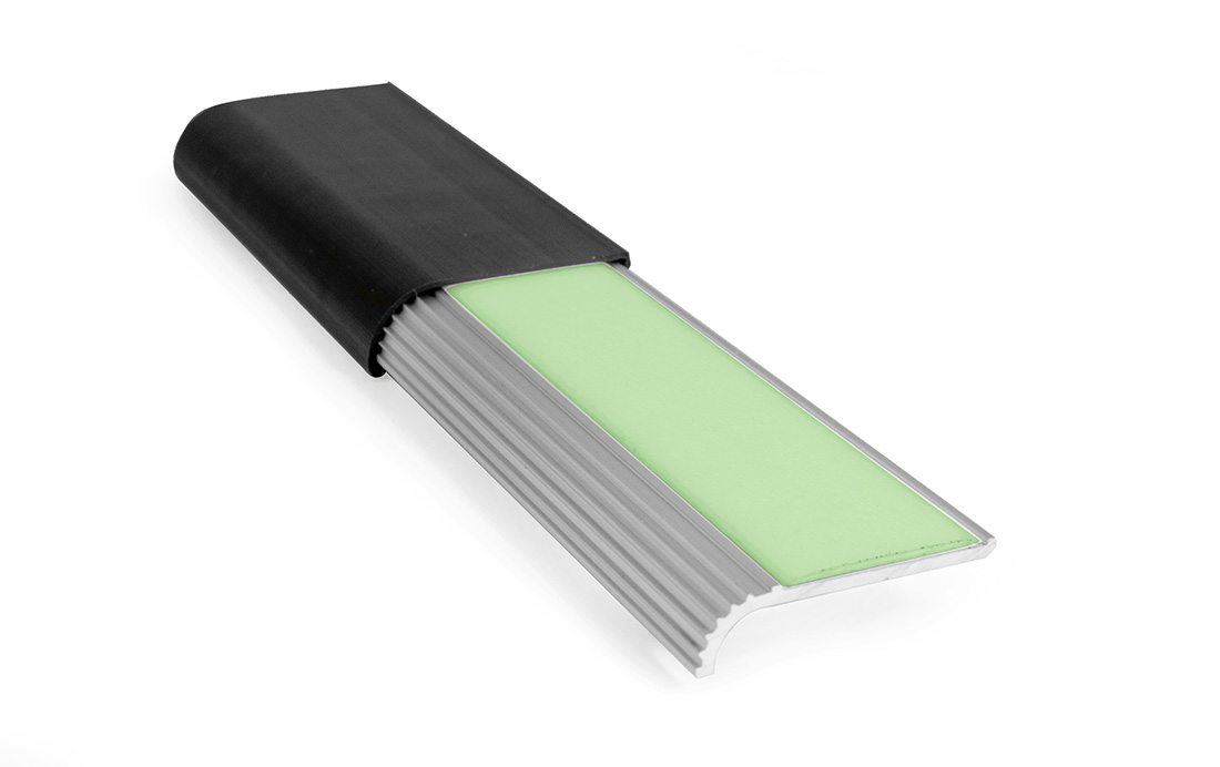 Stair nosings for commercial, industrial, or residential building stair treads. Creating a photoluminescent / luminous path marking or abrasive contrasting strip for high visibility and non-slip. ADA, OSHA, IBC, IFC, NFPA, ASTM, UL compliant.