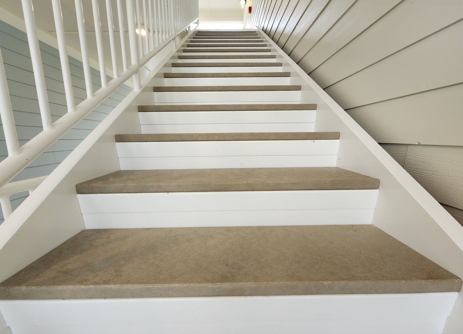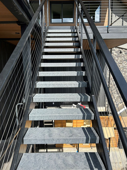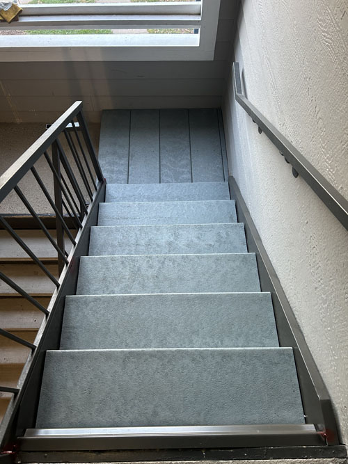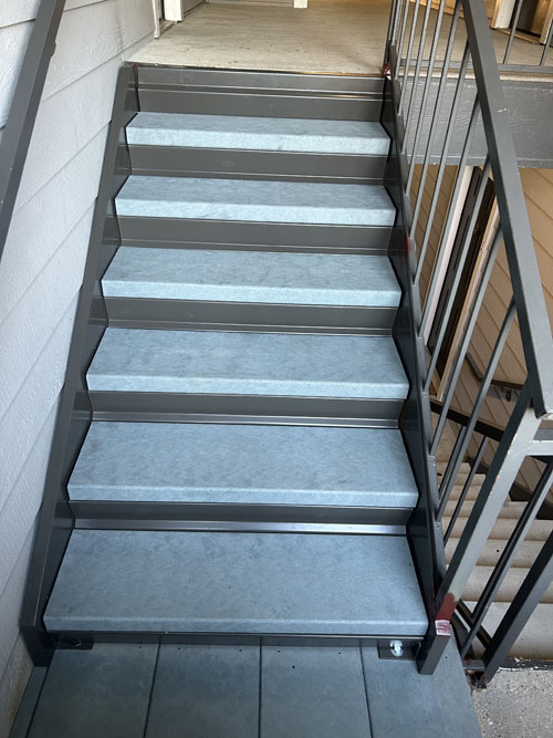 A new 150 apartment unit project with 26 stairways. The metal stairs we’ve fabricated with metal flat pans to accept Perma-Tread 212 as an instant alternative finish to precast concrete treads. The selected color was Weathered Concrete to resemble a traditional concrete look. Perma-Tread offered a lighter weight solution which greatly saved freight and installation costs. Perma-Tread was selected because of immediate availability, no loss, cost savings, no maintenance, non-corrosive properties, and for long lifespan as an alternative to precast concrete treads.