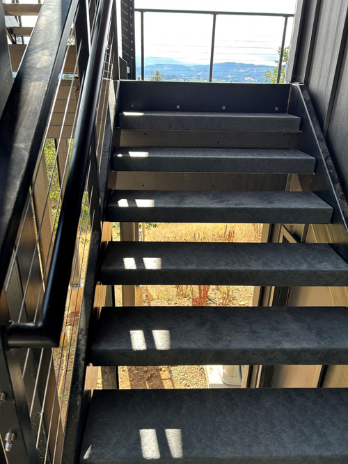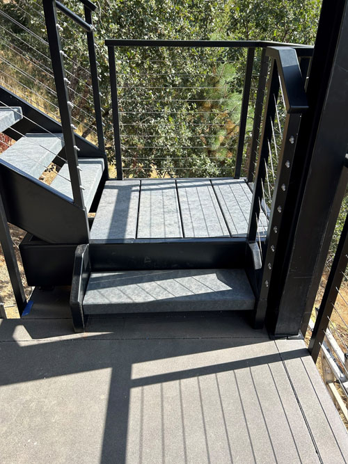 This new residential deck stair was originally designed for open riser precast concrete treads. When weight and durability of concrete became a concern after the metal stair structure was installed, sourcing concrete treads became an issue for the homeowner. Perma-Tread 412 Dark Gray was selected as the final solution. The material was cut to size on site with ordinary tools and installed like lumber. Free spanning between stringers attached to seat angles from underneath.
