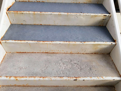 A food processing facility needed to repair their exterior metal pan filled stairs to resolve safety concerns created by concrete corrosion. Concrete was removed from the stair pans. Perma-Tread 212 Wet Cement was selected. Cut to size on site, modified to fit the metal pan, and dropped in for an instant finish creating a better result that will not corrode again.