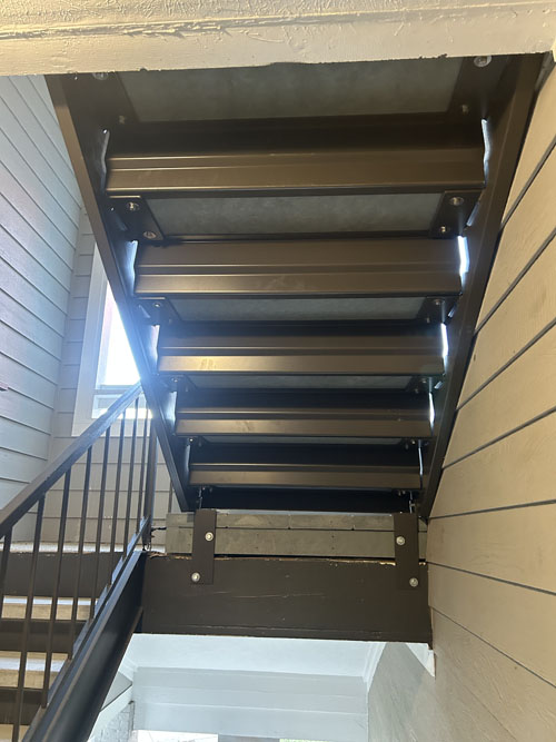 The original metal stairs of this existing apartment home complex were protected from the elements; however, concrete filled landings and precast concrete treads deteriorated over the years due to the humid climate. Perma-Tread 312 wet cement was selected as an alternative replacement solution to concrete. Perma-Tread was selected because of construction cost savings, free-span structural characteristics, no maintenance requirements, and non-corrosive properties.