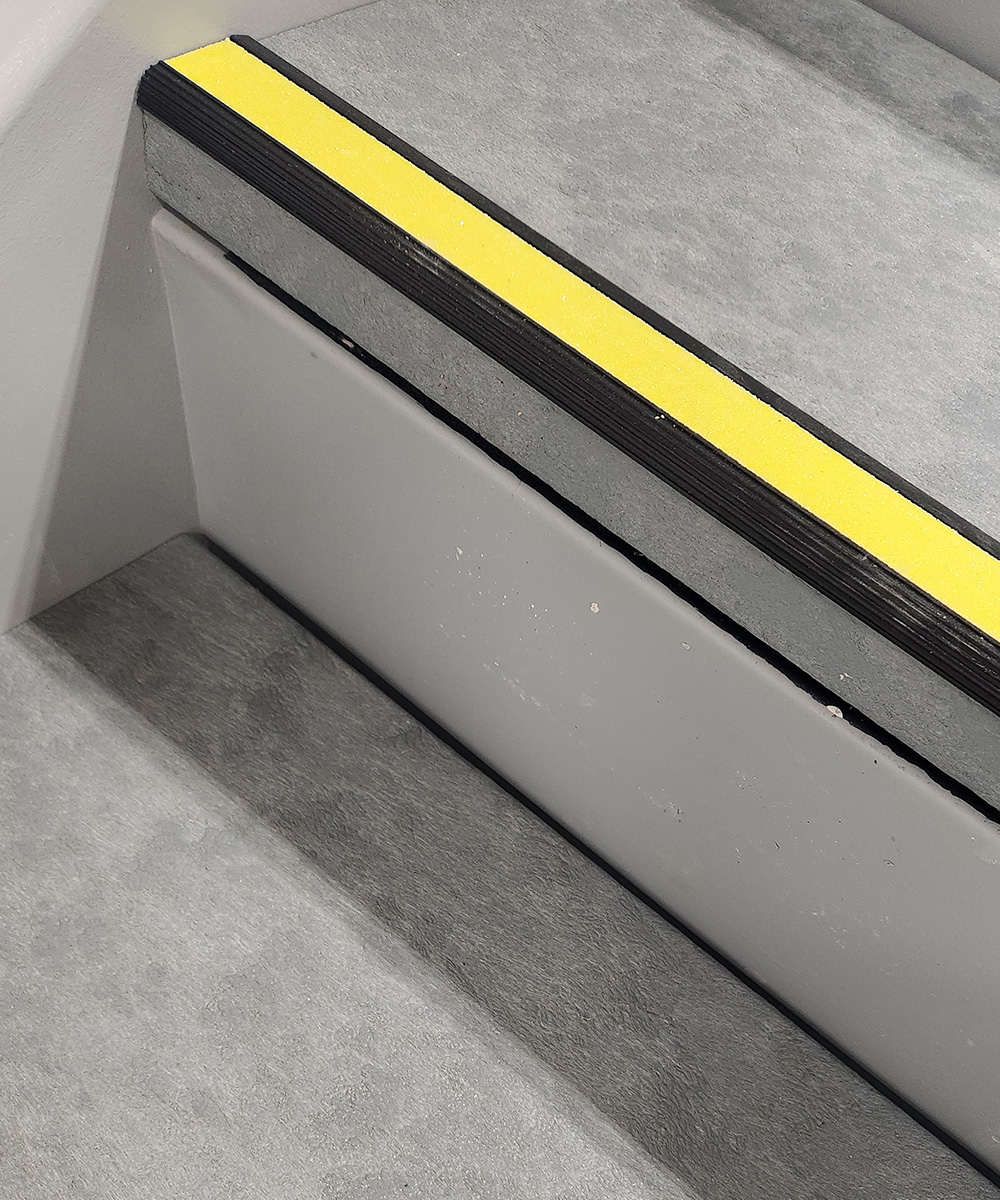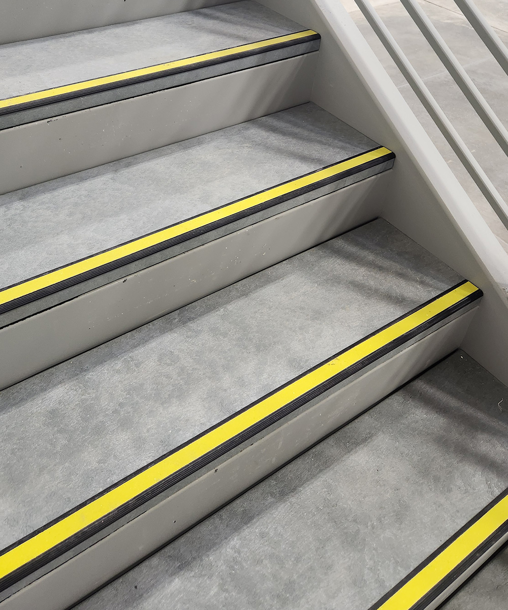Enhance the slip-resistance and visibility of the stair treads. Abrasive, ribbed, contrasting stripe, grip strip, or photoluminescent strip options available.