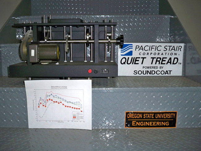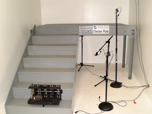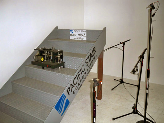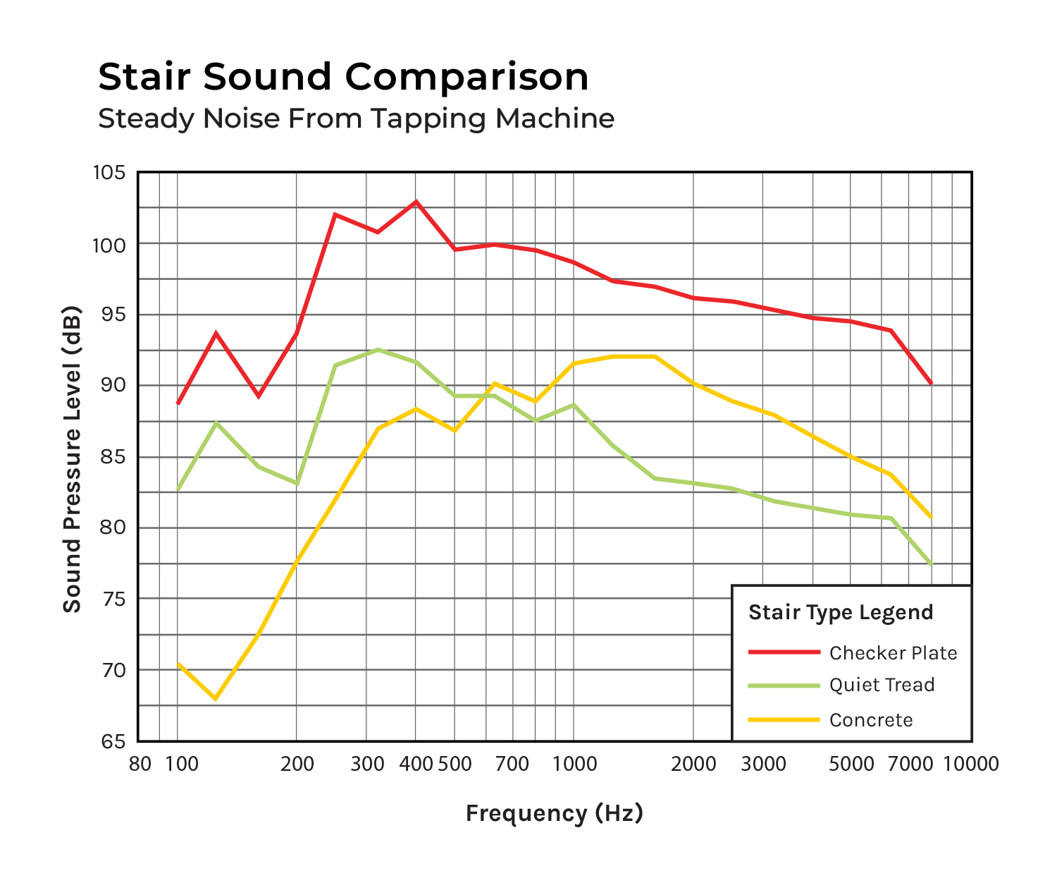 The following information describes the technical ASTM acoustics testing performed on prefabricated metal stairs. Testing was conducted to compare sound levels commonly associated with metal stairs. The Quiet Tread application was compared to traditional checker plate / diamond plate metal stairs, concrete pan filled metal stairs, and spray on acoustic applications.