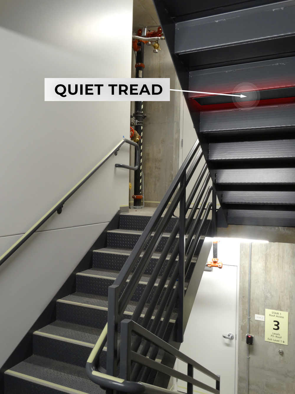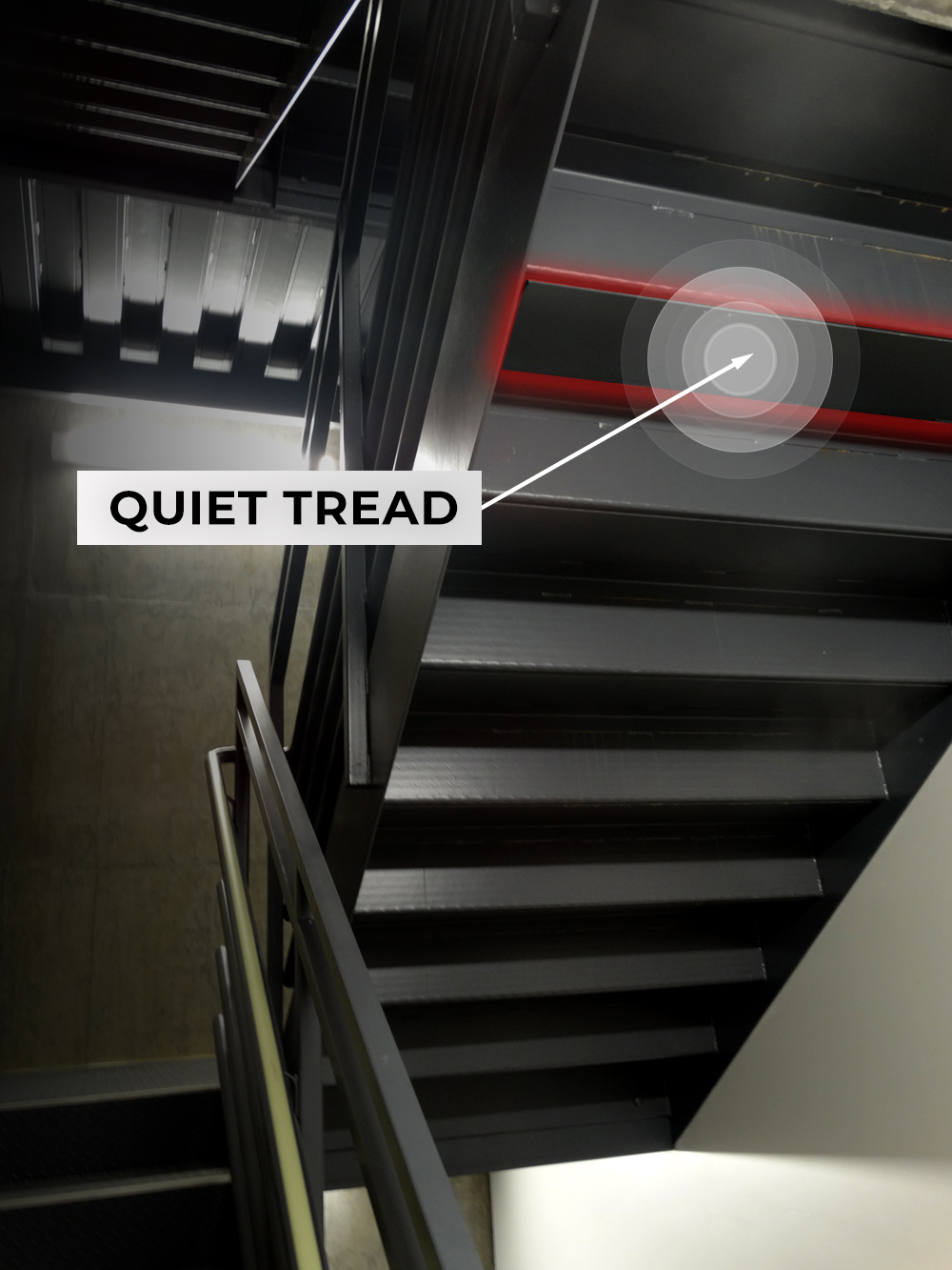 When applied to the step only, Quiet Tread’s sound dampening is comparable to traditional concrete filled stair pans on prefabricated steel stairs.