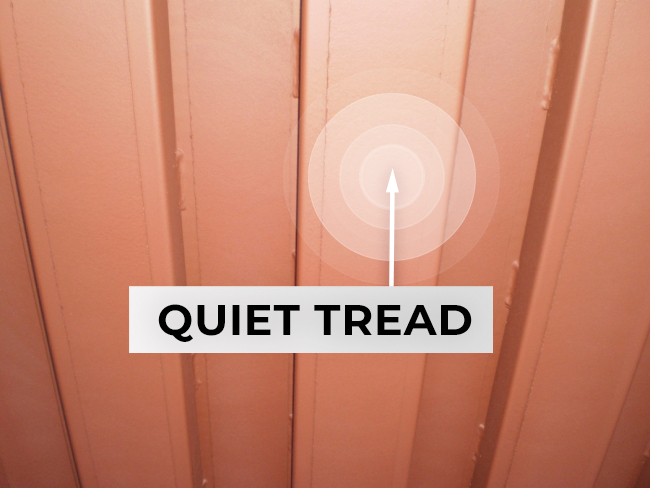 Quiet Tread was created to solve the noise issue immediately for the least amount of ownership overall cost. It is a simple peel and stick application to the underside of the walking surface, and requires minimal preparation, labor, and zero maintenance after installation. Eliminating on-site time, labor, and various trades outweighs the Quiet Tread investment.