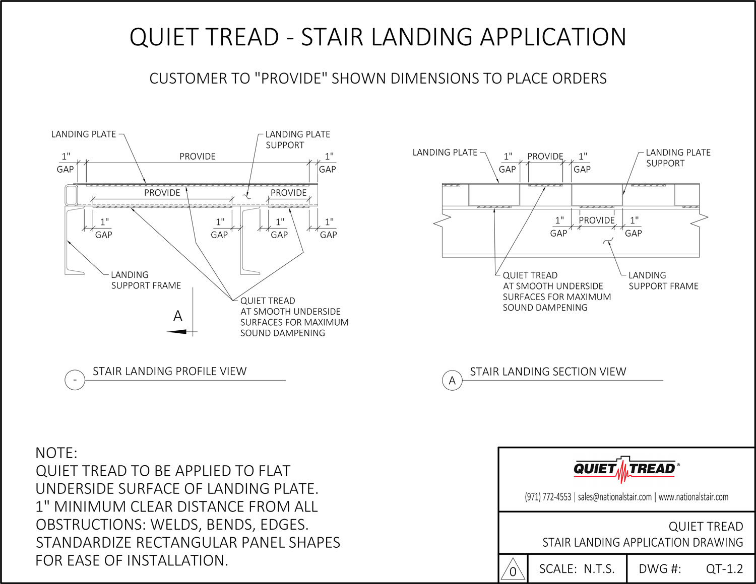 Quiet Tread is a peel and stick application to the underside of stair treads and landings where foot traffic occurs. Quiet Tread must be attached to a smooth, clean, dry surface. Each edge of Quiet Tread 1-2 inches away from edges, obstructions, bends, and welds. This is to guarantee the best result, the most coverage for absorbing the most vibration to reduce sound. The product must be applied completely flat for a lasting adhesive bond.